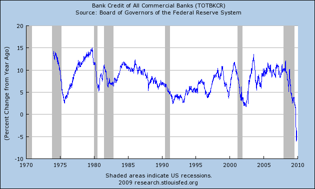 Mish es gestor de patrimonios, y escribe y mantiene su prestigioso blog, Global Economic Trend Analysis. En contraposición a Faber, Mish se muestra mucho más cauto al predecir hiperinflación, y ve una clara tendencia deflacionaria, resumida, entre otros factores, en el desplome del crédito (como se muestra en este gráfico).