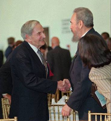 Es decepcionante ver a Fidel Castro dándole la mano a esta Hiena. Se cumple la enseñanza de que tanto el Comunismo como el Capitalismo son dos caras de la misma moneda Judía para dividir y conquistar, según los Protocolos de los Sabios de Sion.